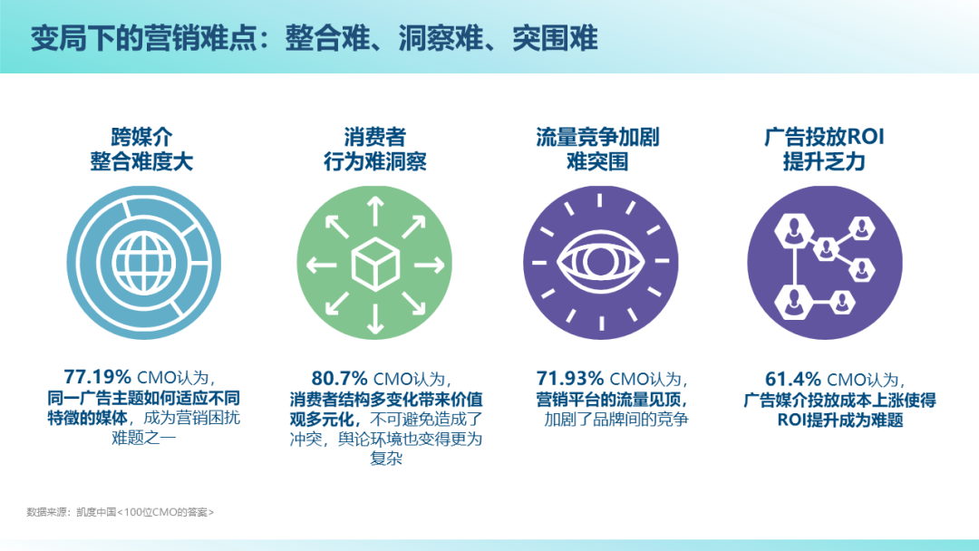 與此同時(shí),政府出臺(tái)的反壟斷政策,促進(jìn)平臺(tái)間壁壘逐步被打破,全域營(yíng)銷時(shí)代已全面到來(lái)。然而,跨媒介整合難度大、消費(fèi)者行為難洞察、流量競(jìng)爭(zhēng)加劇難突圍、廣告投放ROI提升乏力都成為變局下的營(yíng)銷難點(diǎn)。
